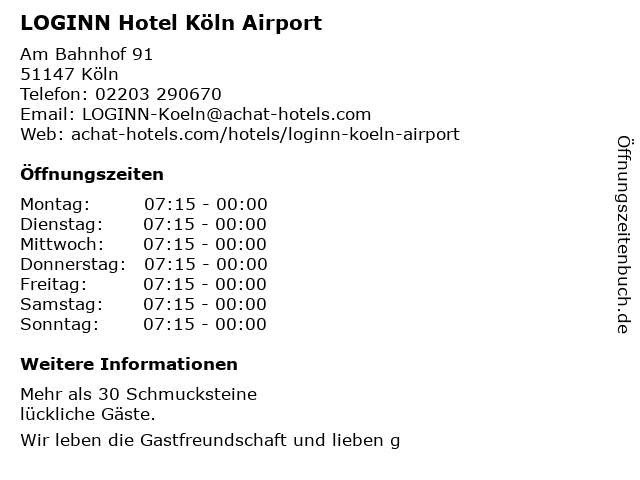 | Öffnungszeiten LOGINN Hotel Köln Airport in Köln anzeigen | |