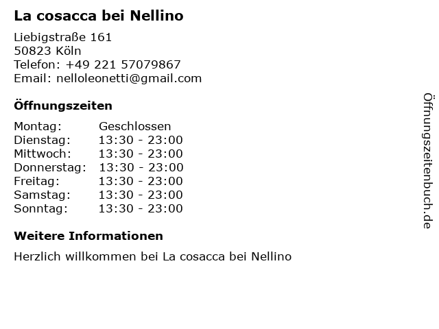 | Öffnungszeiten La cosacca bei Nellino in Köln anzeigen | |