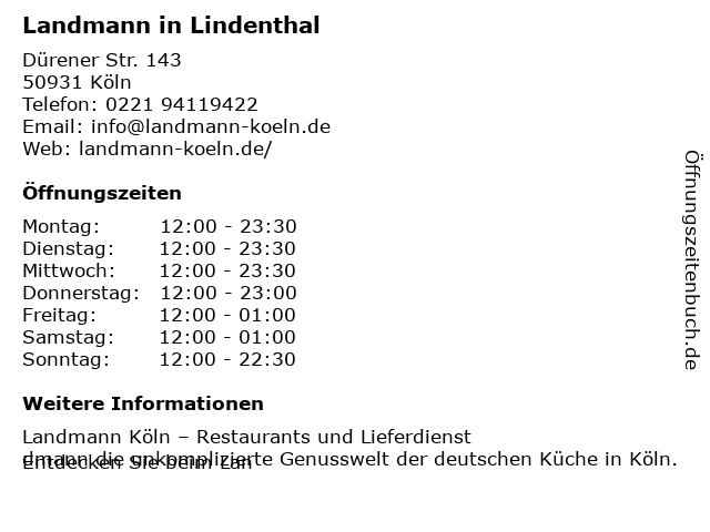 | Öffnungszeiten Landmann in Lindenthal in Köln anzeigen | |