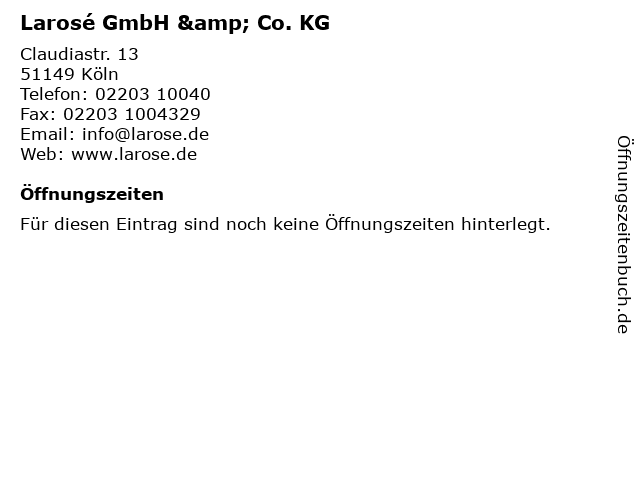 | Öffnungszeiten Larosé GmbH & Co. KG in Köln anzeigen | |