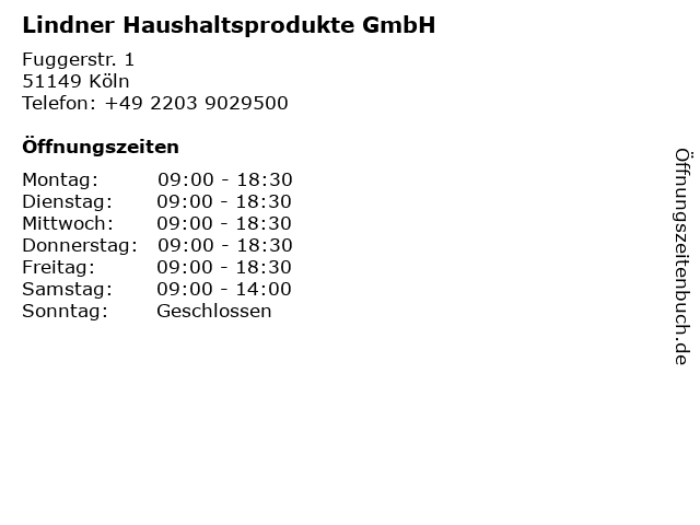 | Öffnungszeiten Lindner Haushaltsprodukte GmbH in Köln anzeigen | |