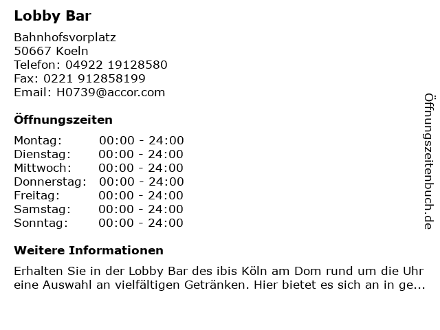 | Öffnungszeiten Lobby Bar in Koeln anzeigen | |