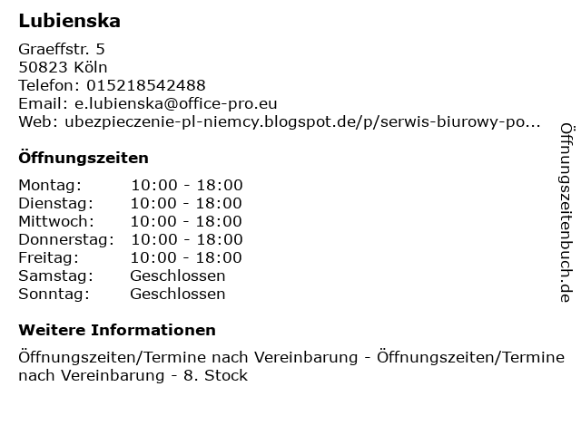 | Öffnungszeiten Lubienska in Köln anzeigen | |