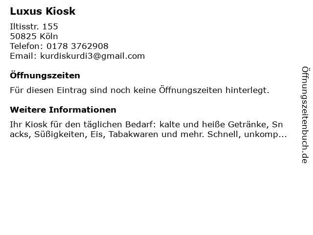 | Öffnungszeiten Luxus Kiosk in Köln anzeigen | |