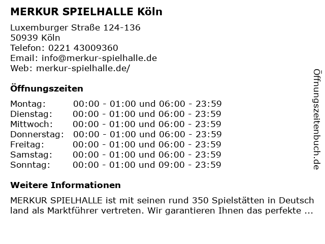 | Öffnungszeiten MERKUR SPIELHALLE Köln in Köln anzeigen | |