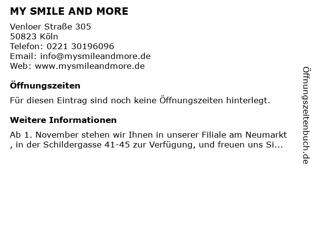 | Öffnungszeiten MY SMILE AND MORE in Köln anzeigen | |
