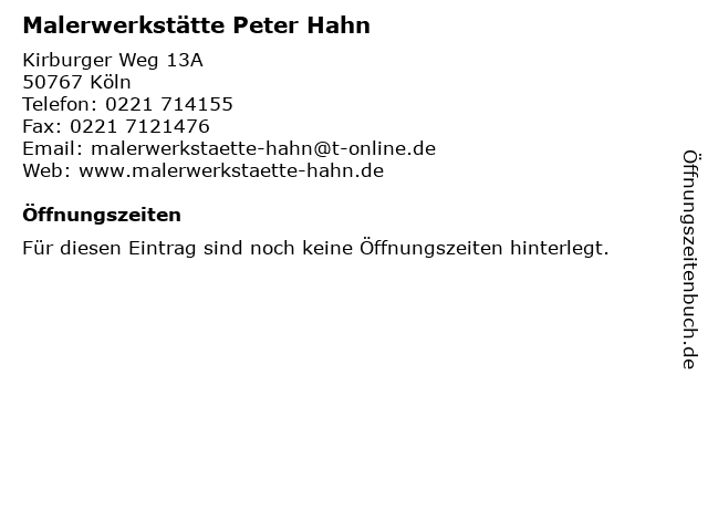 | Öffnungszeiten Malerwerkstätte Peter Hahn in Köln anzeigen | |