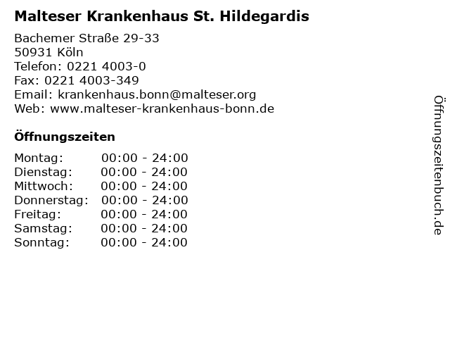 1 Malteser Krankenhaus St. Hildegardis - Besuchszeiten (Entfernung: 0,00 km) Bachemer Straße 29-33, 50931 Köln 2 Malteser Krankenhaus St. Hildegardis - Cafeteria (Entfernung: 0,00 km) Bachemer Straße 29-33, 50931 Köln 5 6 |