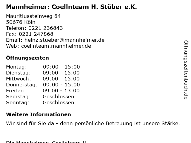 Branchen & Suchbegriffe zu Mannheimer: Coellnteam H. Stüber e.K.:coellnteam, e.k., h., mannheimer, stüber |