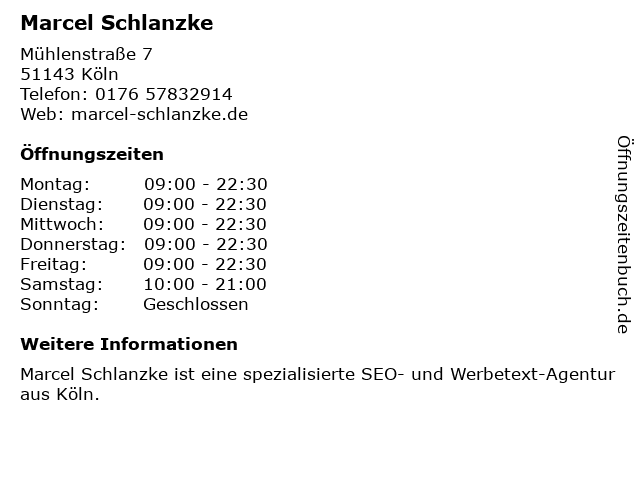 | Öffnungszeiten Marcel Schlanzke in Köln anzeigen | |
