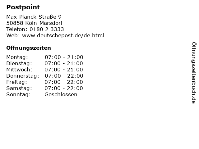 | Öffnungszeiten Postpoint in Köln-Marsdorf anzeigen | |