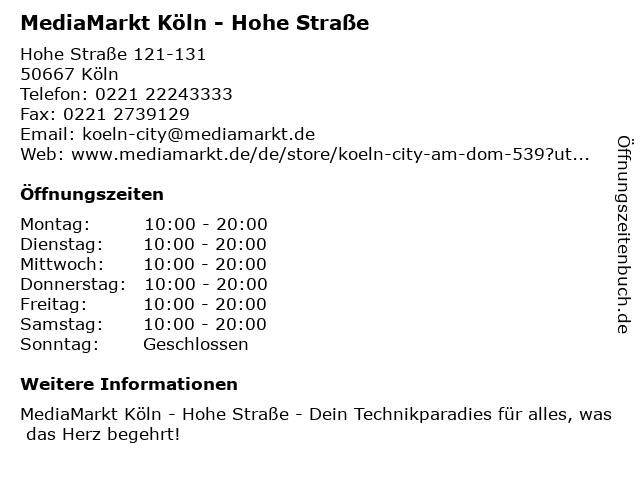 Öffnungszeiten MediaMarkt Köln - Hohe Straße in Köln anzeigen | |