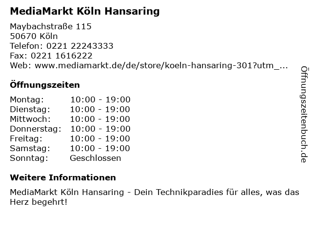 Öffnungszeiten MediaMarkt Köln Hansaring in Köln anzeigen | |