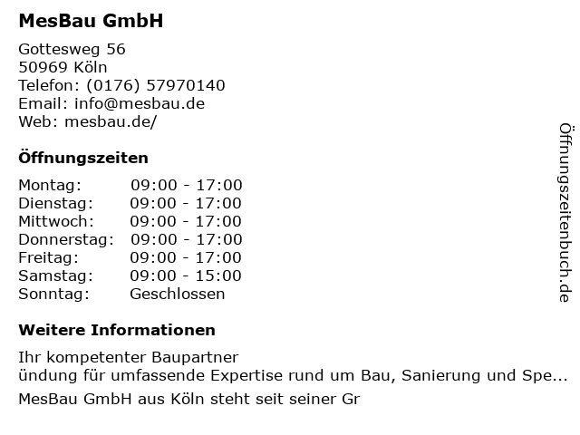 | Öffnungszeiten MesBau GmbH in Köln anzeigen | |