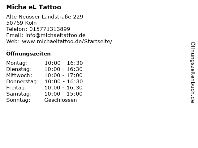 | Öffnungszeiten Micha eL Tattoo in Köln anzeigen | |