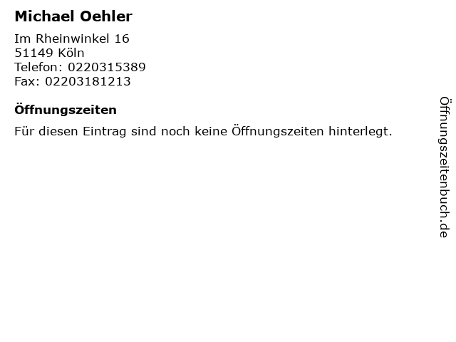 | Öffnungszeiten Michael Oehler in Köln anzeigen | |