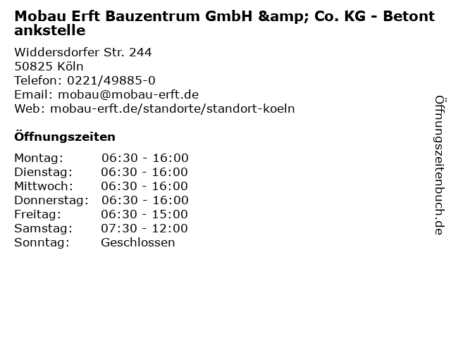 1 Mobau Erft Bauzentrum GmbH & Co. KG - Betontankstelle (Entfernung: 6,09 km) Bonnstraße 12, 50226 Frechen 2 Mobau Erft Bauzentrum GmbH & Co. KG - Baustofffachhandel (Entfernung: 0,00 km) Widdersdorfer Straße 244, 50825 Köln 6 |
