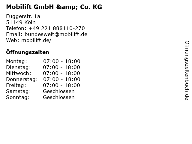 | Öffnungszeiten Mobilift GmbH & Co. KG in Köln anzeigen | |