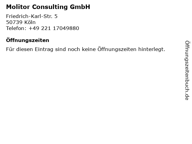 | Öffnungszeiten Molitor Consulting GmbH in Köln anzeigen | |