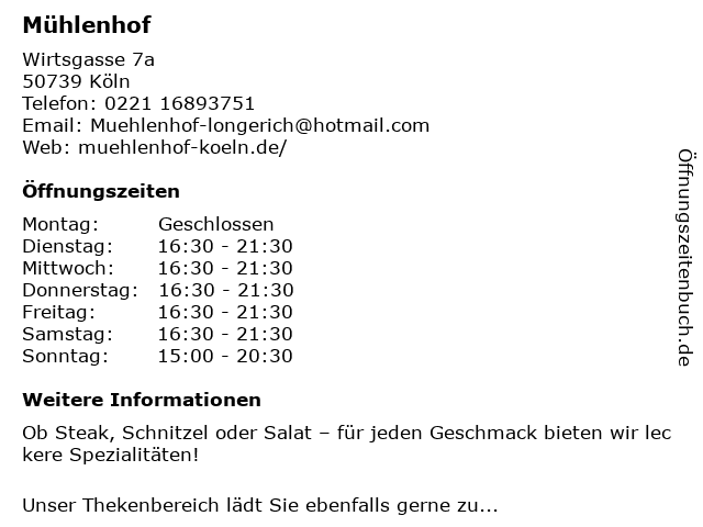 | Öffnungszeiten Mühlenhof in Köln anzeigen | |