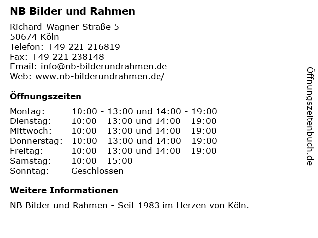 | Öffnungszeiten NB Bilder und Rahmen in Köln anzeigen | |