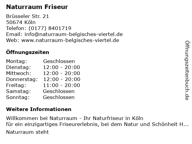 | Öffnungszeiten Naturraum Friseur in Köln anzeigen | |