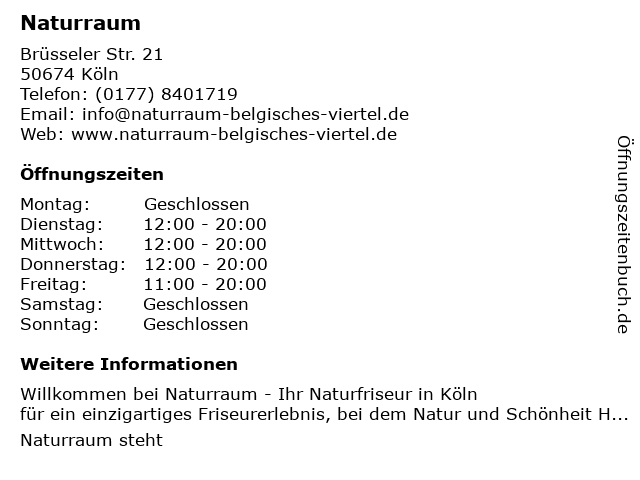 Öffnungszeiten Naturraum in Köln anzeigen | |
