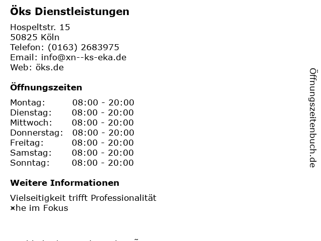 | Öffnungszeiten Öks Dienstleistungen in Köln anzeigen | |
