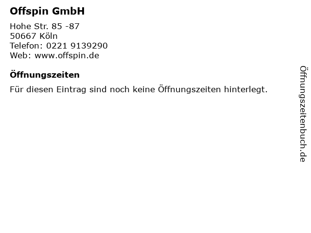 | Öffnungszeiten Offspin GmbH in Köln anzeigen | |