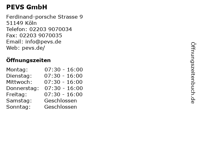 | Öffnungszeiten PEVS GmbH in Köln anzeigen | |