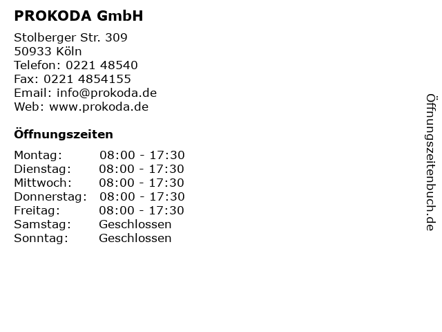 | Öffnungszeiten PROKODA GmbH in Köln anzeigen | |