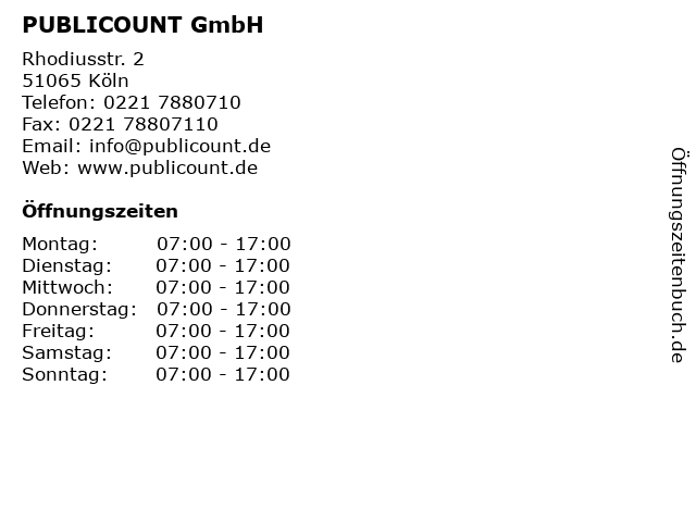 | Öffnungszeiten PUBLICOUNT GmbH in Köln anzeigen | |