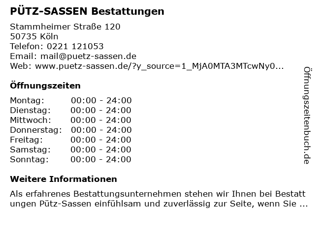 | Öffnungszeiten PÜTZ-SASSEN Bestattungen in Köln anzeigen | |