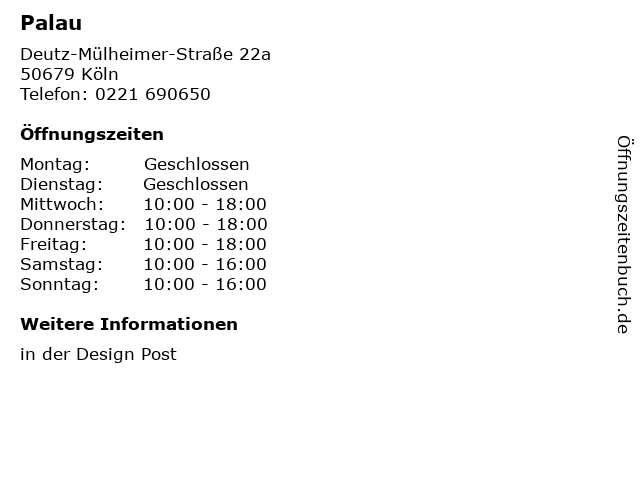 | Öffnungszeiten Palau in Köln anzeigen | |