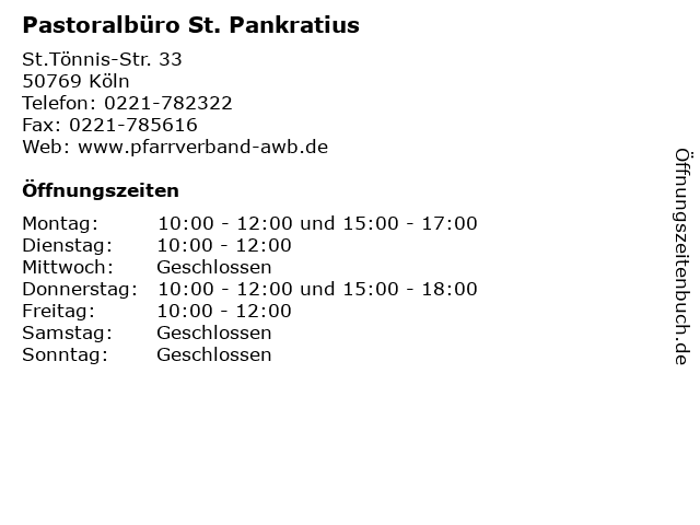 | Öffnungszeiten Pastoralbüro St. Pankratius in Köln anzeigen | |