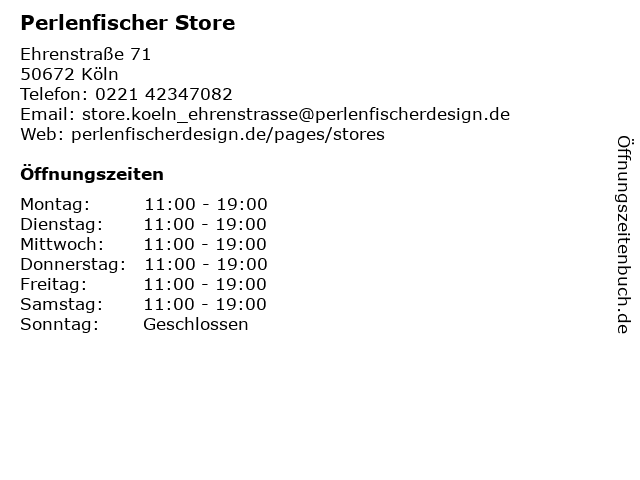 | Öffnungszeiten Perlenfischer Store in Köln anzeigen | |