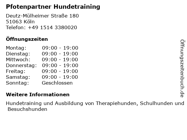 | Öffnungszeiten Pfotenpartner Hundetraining in Köln anzeigen | |