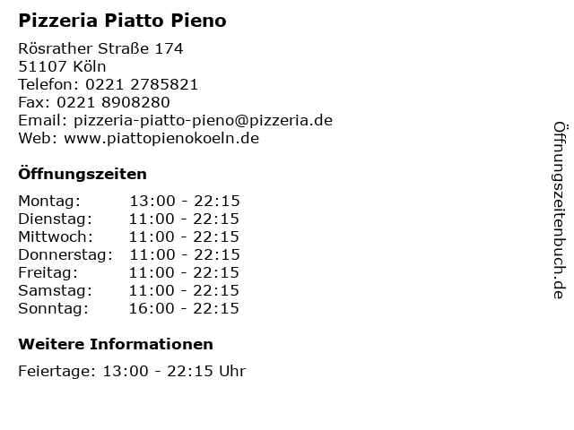 | Öffnungszeiten Pizzeria Piatto Pieno in Köln anzeigen | |
