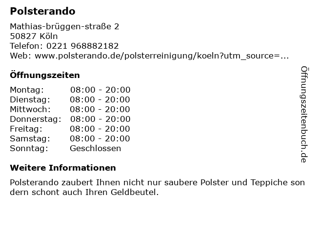 | Öffnungszeiten Polsterando in Köln anzeigen | |