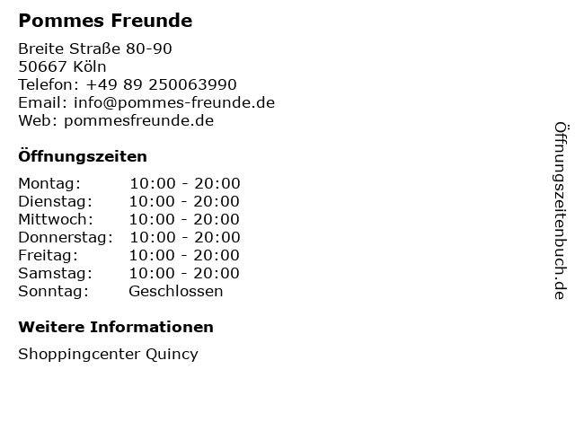 | Öffnungszeiten Pommes Freunde in Köln anzeigen | |