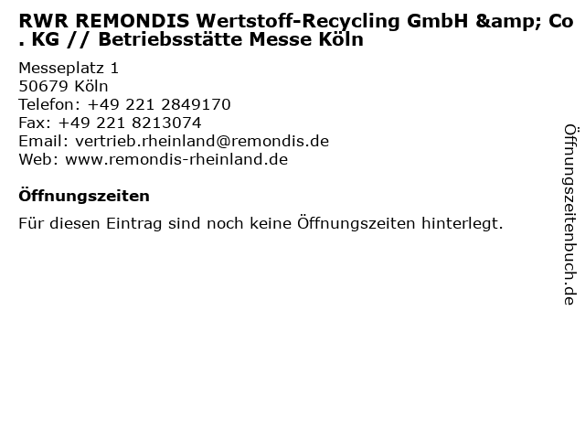 | RWR REMONDIS Wertstoff-Recycling GmbH & Co. KG // Betriebsstätte Messe Köln anrufen | |