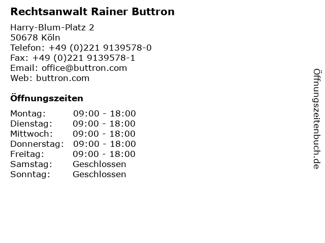 | Öffnungszeiten Rechtsanwalt Rainer Buttron in Köln anzeigen | |