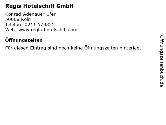 | Öffnungszeiten Regis Hotelschiff GmbH in Köln anzeigen | |