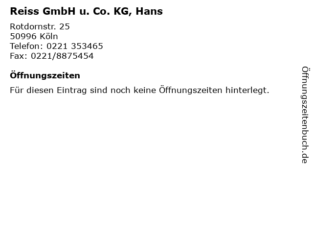 | Öffnungszeiten Reiss GmbH u. Co. KG, Hans in Köln anzeigen | |