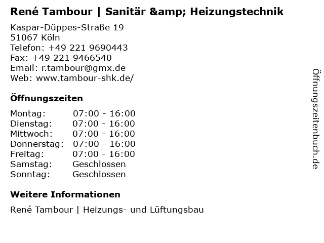 1 Stallberg Sanitär- und Heizungstechnik GmbH Solaranalagen Solaranlagentechnik (Entfernung: 1,59 km) Piccoloministr. 30, 51063 Köln 3 Tony Klüppel Sanitär & Heizungstechnik (Entfernung: 3,35 km) Mülheimer Str. 192, 51469 Bergisch Gladbach 5 Sanitär- u. Heizungstechnik Rudolf Jung (Entfernung: 7,25 km) Bergische Landstr. 56, 51375 Leverkusen 6 |
