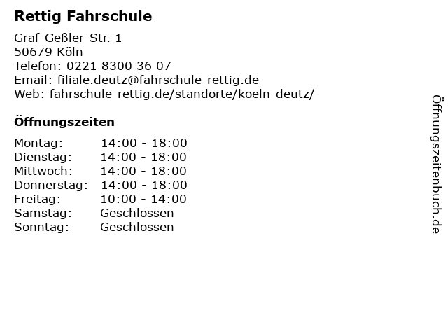 | Öffnungszeiten Rettig Fahrschule in Köln anzeigen | |