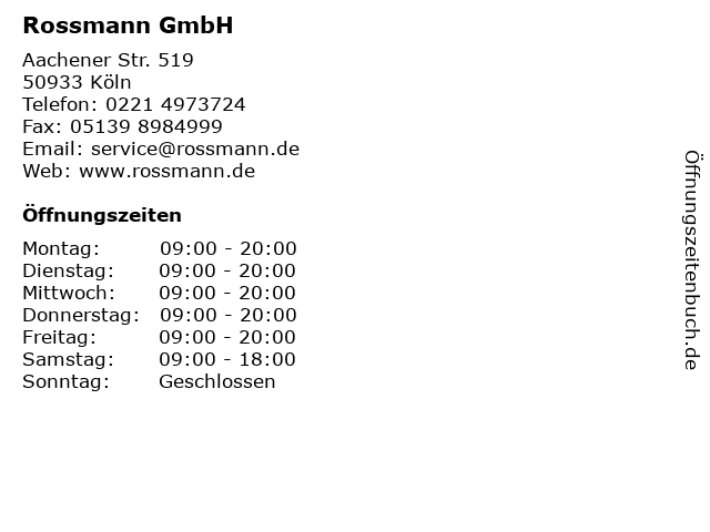 | Öffnungszeiten Rossmann GmbH in Köln anzeigen | |