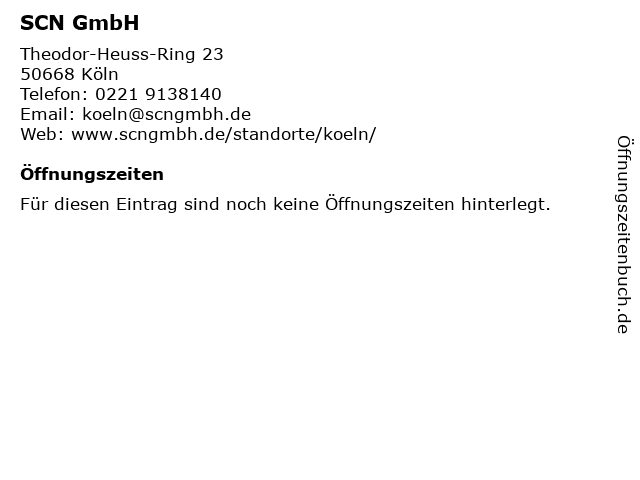 | Öffnungszeiten SCN GmbH in Köln anzeigen | |