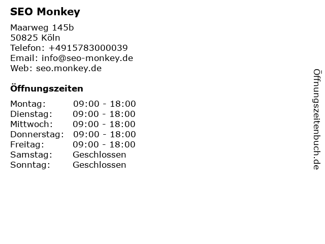 | Öffnungszeiten SEO Monkey in Köln anzeigen | |