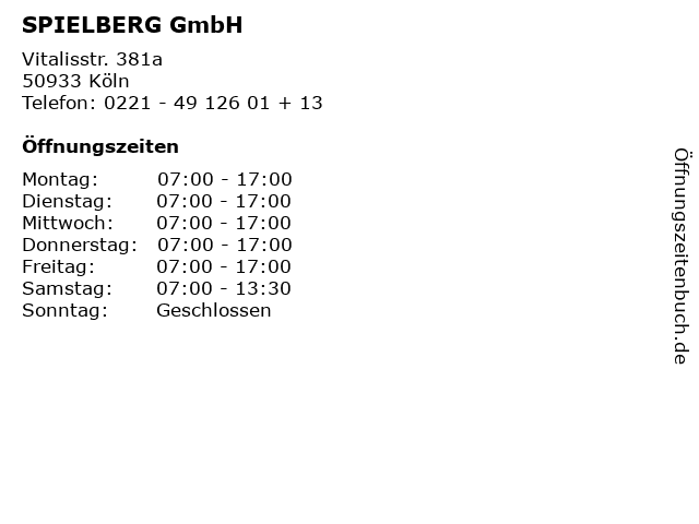| Öffnungszeiten SPIELBERG GmbH in Köln anzeigen | |